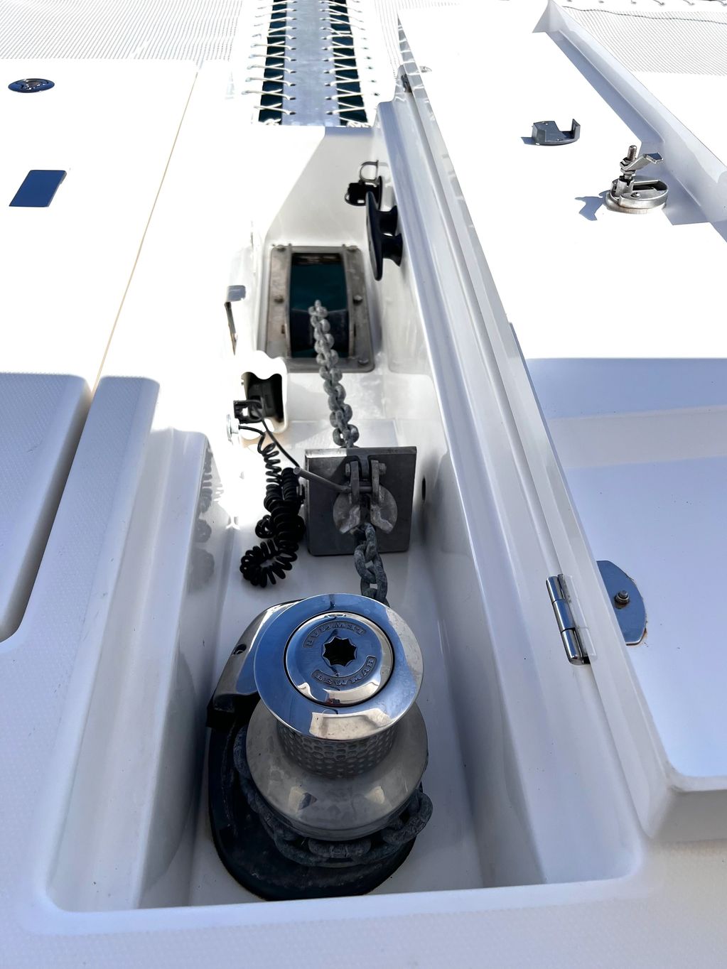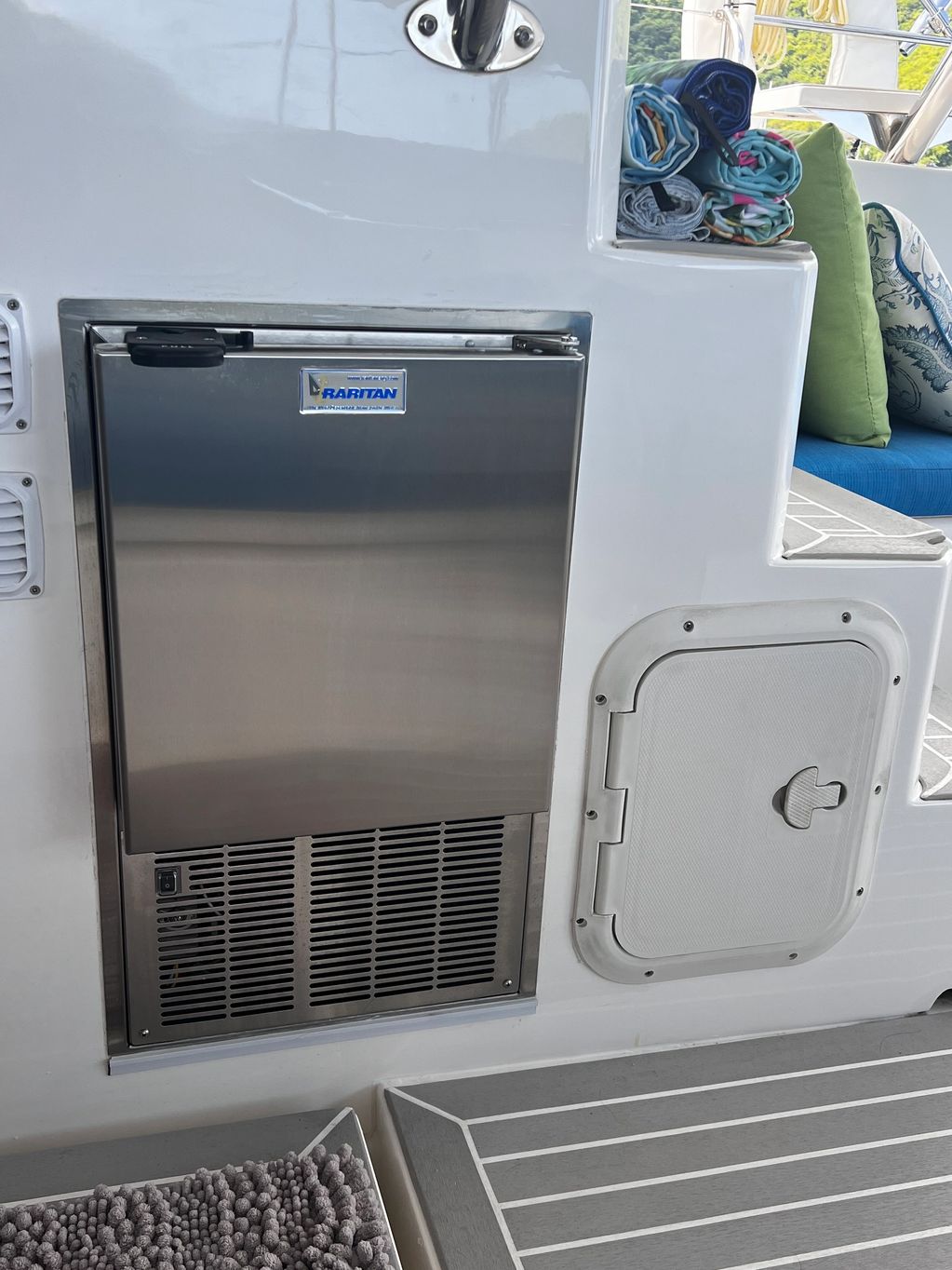 The Raritan Icemaker is a great addition and is just outside the saloon in the aft cockpit. Note the hatch to the right of the ice maker. This hatch allows you to use the hollow space under the helm steps for additional storage. You can never have enough storage space.