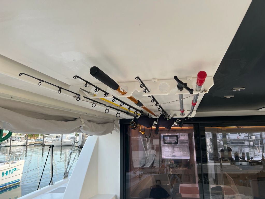 Fishing Rod rack above aft cockpit table. Room for 8 items. We keep Fishing Rods, Book Hooks, Australian Sling, Gaff, etc. Gives you easy access, out of the way, and pretty well protected from the elements.