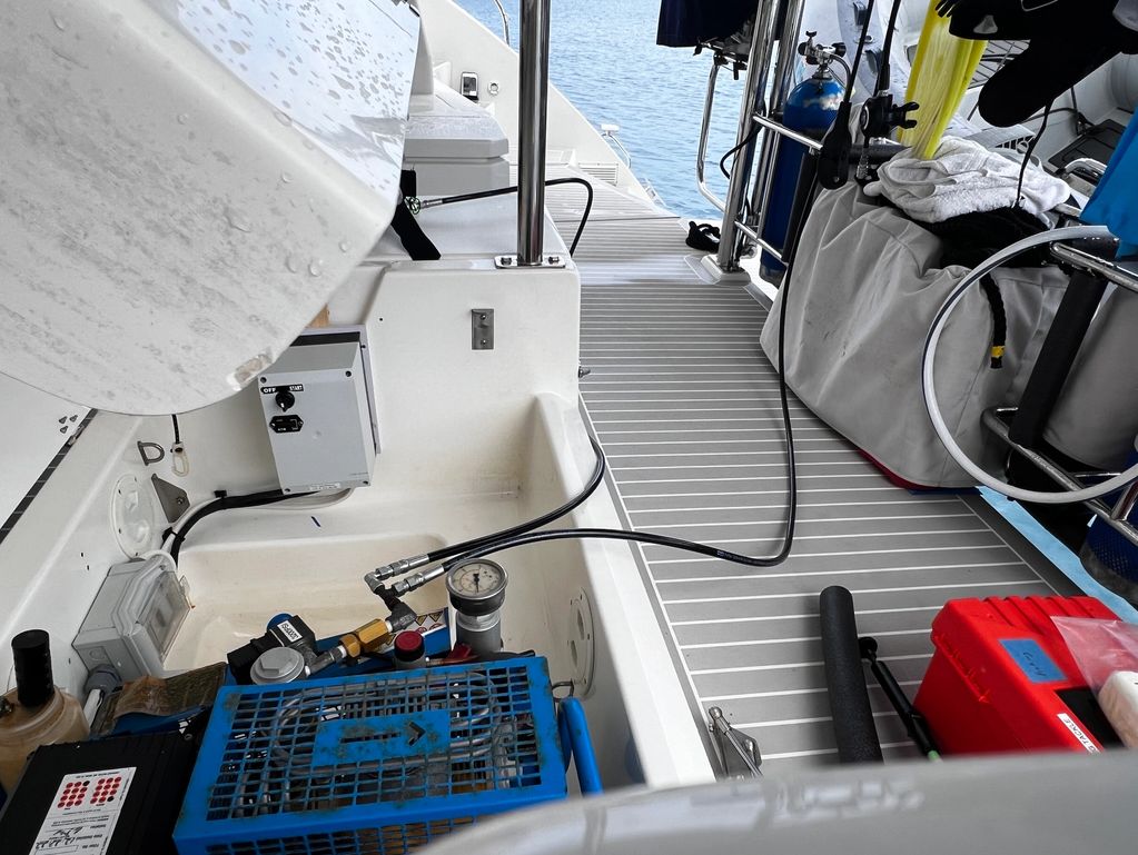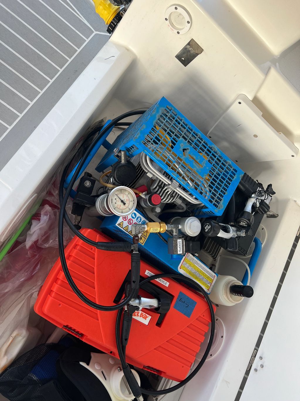 The Dive Compressor is located under the back seat in the aft cockpit. It runs directly off the generator. It has two whips long enough to reach the tanks when they are resting in the custom scuba tank racks that are part of the stern rail.