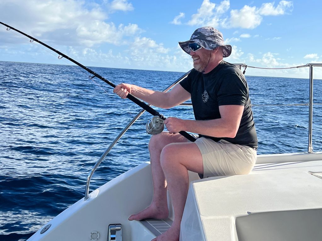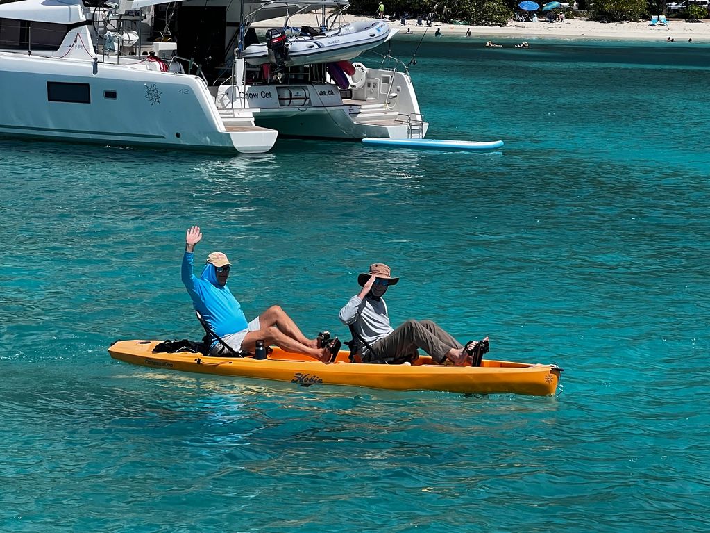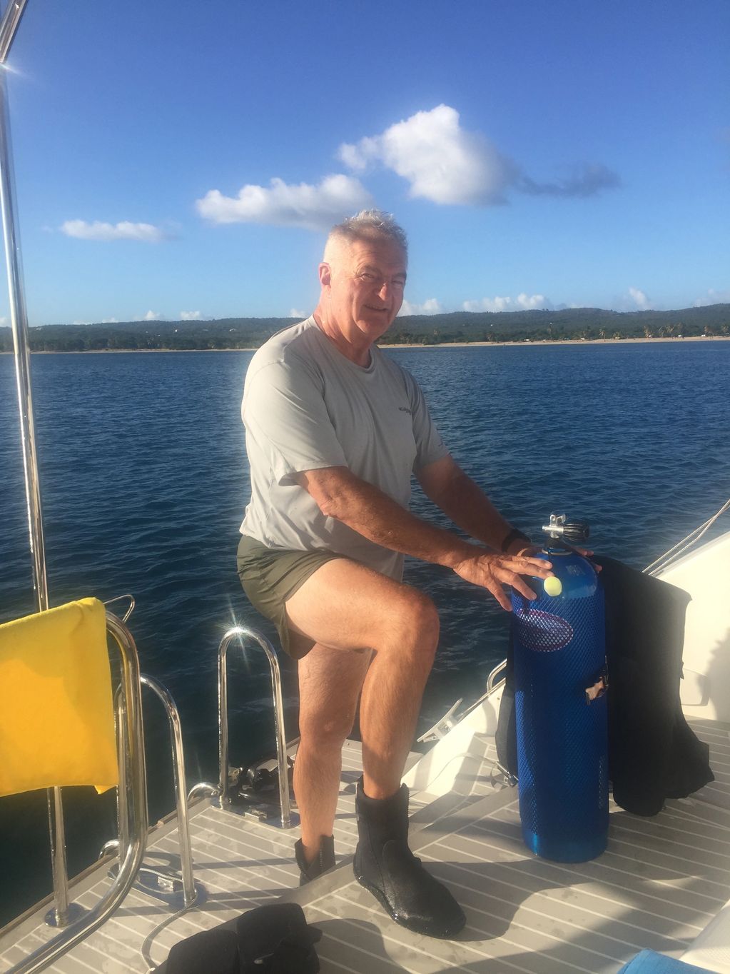 Catamarans are a perfect dive platform. Step right off the transom and go for a dive. Swim ladder is deep enough and strong enough to easily get back on the boat. I hate to admit it, but I have been a certified Scuba diver for more than 50 years. I love my time in the water. My initial certification was in a college PE class at Penn State in Dec 1973.